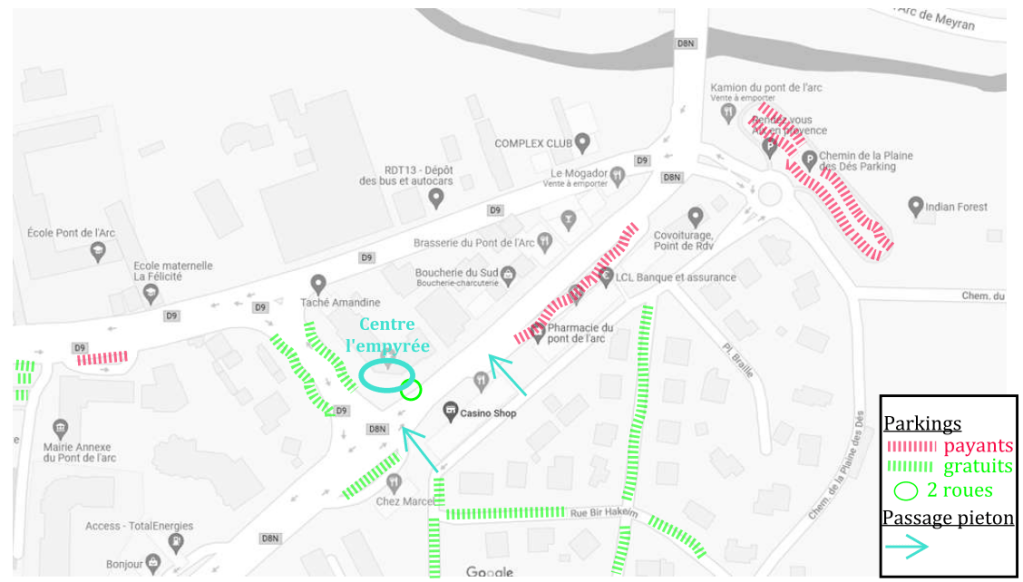 Venir en voiture : Sortie d’autoroute 30b « Aix-Pont de l’arc ». Il est possible de se garer gratuitement dans la rue Pascal Fieschi, rue du Colonel Polidori, ou à 3 min à pied depuis le parking Chemin de la Plaine des Dés, devant Indian Forest (1,60 euros les 2h), ou en bas de la mairie annexe de pont de l’arc (45 min gratuites en rentrant votre numéro de plaque dans la borne, puis 1euro de l’heure).